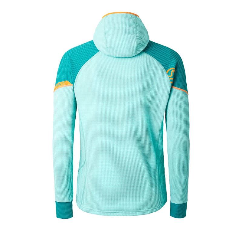 La capucha de estilo balaclava, junto con las costuras planas flatlock y los orificios para el pulgar en las mangas, refuerzan la comodidad y protección térmica. Incorpora además un bolsillo frontal funcional y está confeccionada con tejidos certificados bluesign®, lo que garantiza un proceso de fabricación sostenible y respetuoso con el medio ambiente.