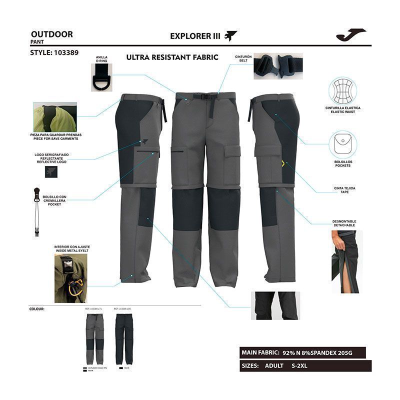 La cinturilla ajustable tiene elástico y cinturón para una mayor fijación a la cintura. Se cierra mediante corchete y cremallera bloqueable. La zona desmontable se quita rápidamente gracias a la incorporación de varias cremalleras. Se ajustan en el bajo mediante stopper y se ha añadido una pieza para fijar el pantalón a las botas.