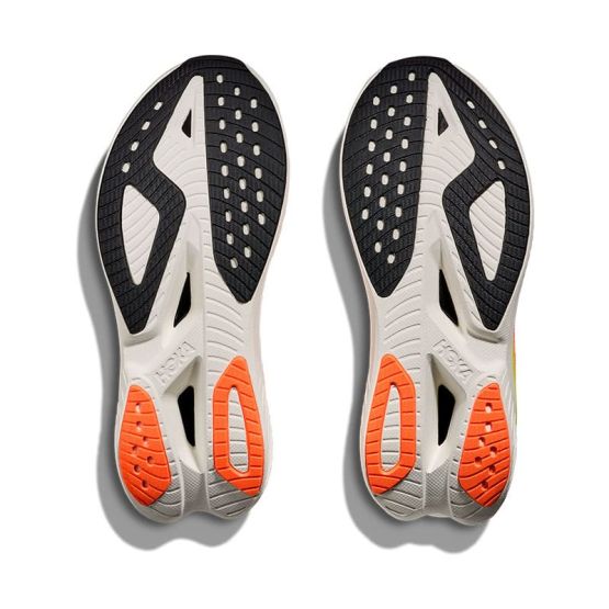 La mediasuela combina espuma EVA para absorción de impactos y PEBA para propulsión, separadas por una placa de TPU con PEBAX que aporta estabilidad y efecto palanca para despegues más ágiles. El perfil maximalista mantiene una transición suave y eficiente, ideal para ritmos de competición.