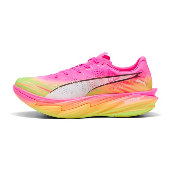 La Deviate Nitro Elite 4 eleva el concepto de zapatilla rápida de Puma a un nuevo nivel. Esta cuarta versión es 15 gramos más ligera que su predecesora y está pensada para corredores que buscan rendimiento puro, tanto en entrenamientos de calidad como en competición. Su combinación de espuma de alto retorno energético, placa de carbono y un upper minimalista convierte a este modelo en una herramienta diseñada para ir más rápido durante más tiempo.