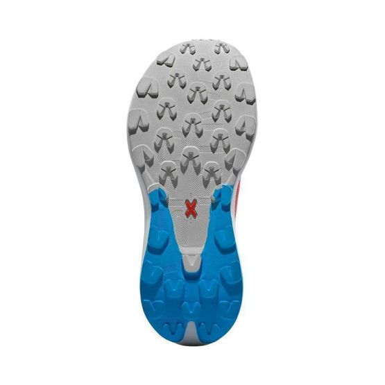 La suela Frixion Red bi-compuesto combina durabilidad en las zonas de mayor desgaste (talón) con máximo agarre en la parte media-delantera. Sus tacos de 4 mm y su rocker medio favorecen la tracción y estabilidad en terrenos variados y técnico.